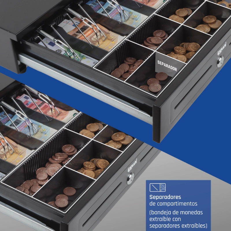 - Compartimentos: 5 billetes y 8 monedas